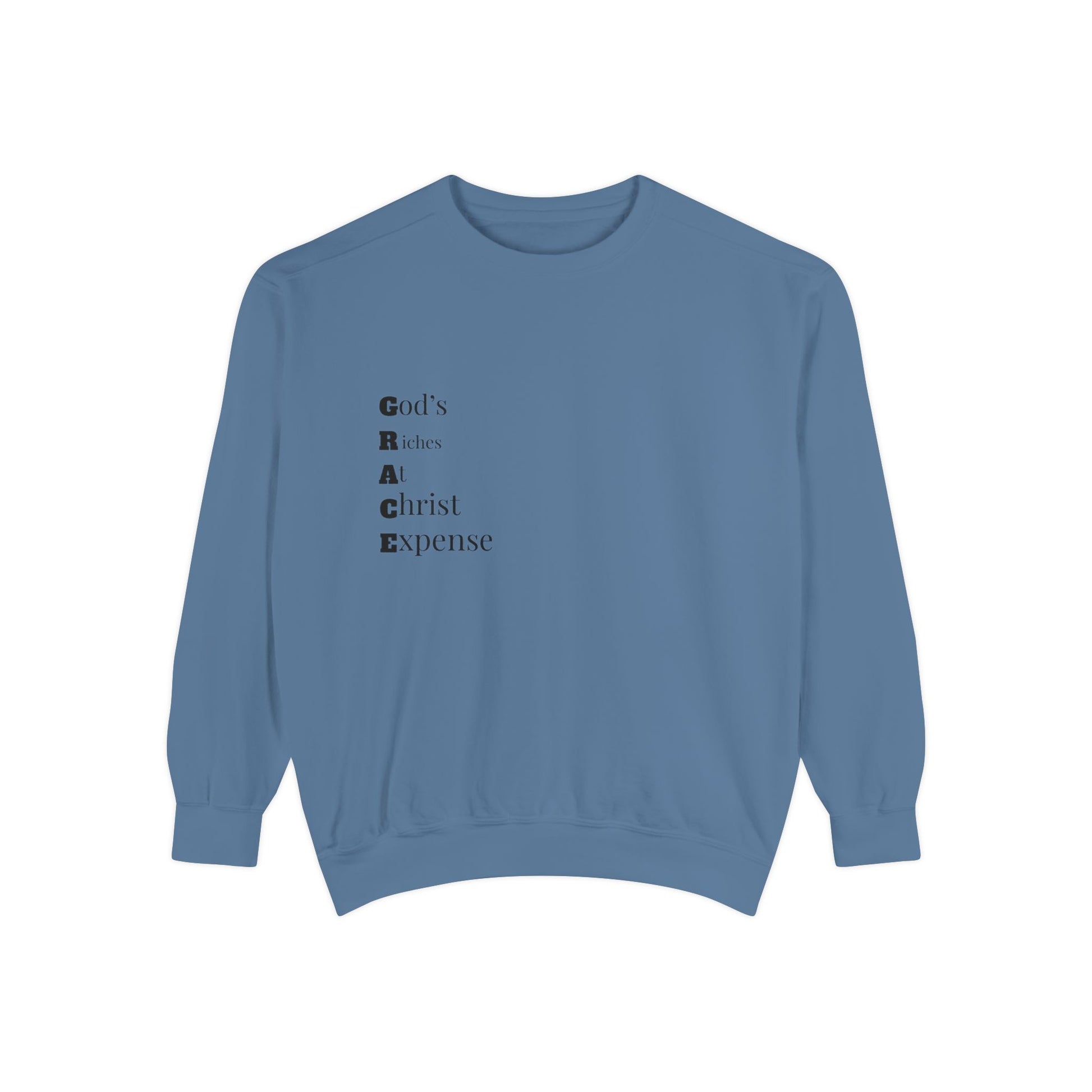 Christian Graphic Sweatshirt — "GRACE: God’s Redemption and Christ’s Expense" with Heart Hand Back Embroidery